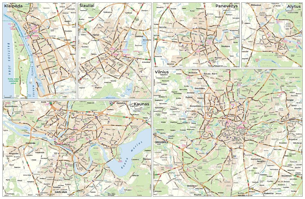 • Viļņas (mērogs 1:100'000), Kauņas (mērogs 1:85'000), Klaipēdas, Šauļu, Panevēžas un Alītas (mērogs 1:75'000) pilsētu plāni